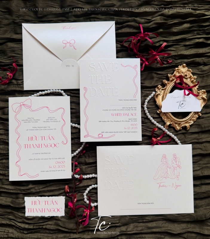 - ฤฦฐแปฃc ép nแปi chแปฏ Save The Date แป hai vแป trí bao thฦฐ và ruแปt bên trong